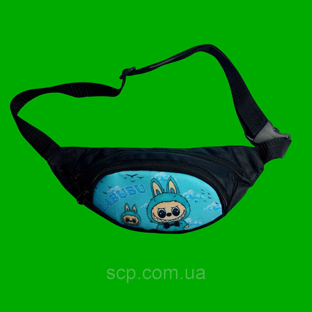 Дитяча сумка-бананка для шанувальників іграшки "Labubu". Носиться на поясі або через плече. Сумка має 2 відділення у передній частині. Довжина ременя регулюється.